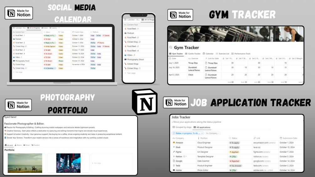 Take control of your work, life, and fitness goals with this powerful Notion Template Bundle. Whether you're job hunting, managing creative projects, planning content, or working on your fitness — this bundle has everything you need in one place.
